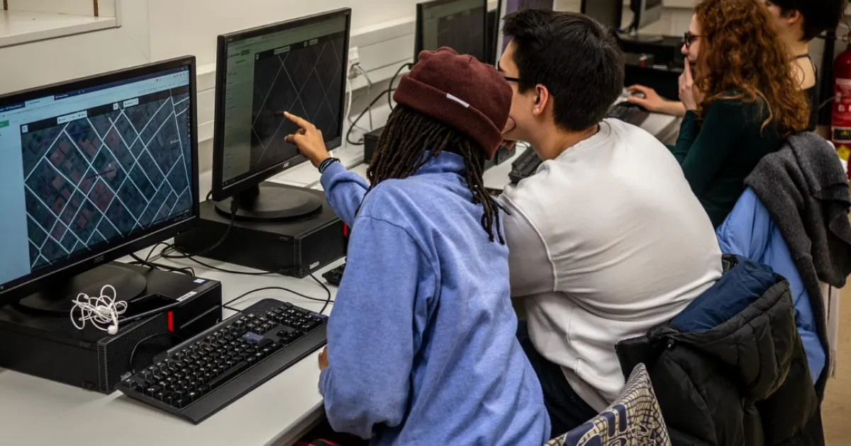 Schülerinnen und Schüler des BRG9 beim Erstellen der Landkarte auf Satellitenbildern.