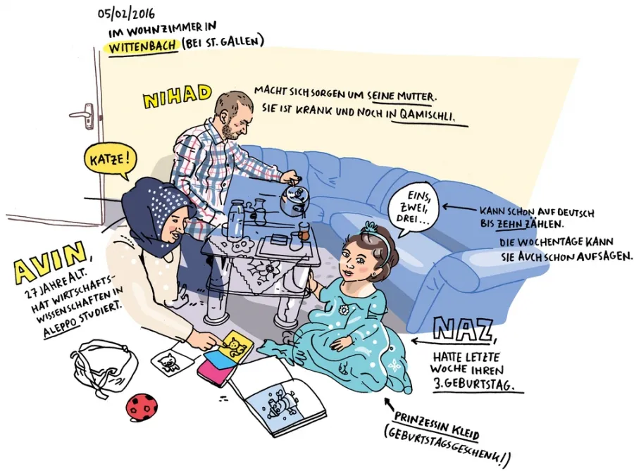 Über 12.000 Dollar kostet sie die Reise in ihr neues Leben, die sie per Minibus, Schlauchboot, Auto und sogar zu Fuß zurücklegen. Nach ihrer Ankunft in der Schweiz im September 2015 kommt die Familie zunächst in eine Asylunterkunft, bevor sie in eine kleine Wohnung in der Nähe von St.Gallen ziehen können. Um sich besser in die Gesellschaft zu integrieren, nehmen alle vier Deutsch- und Französischunterricht.