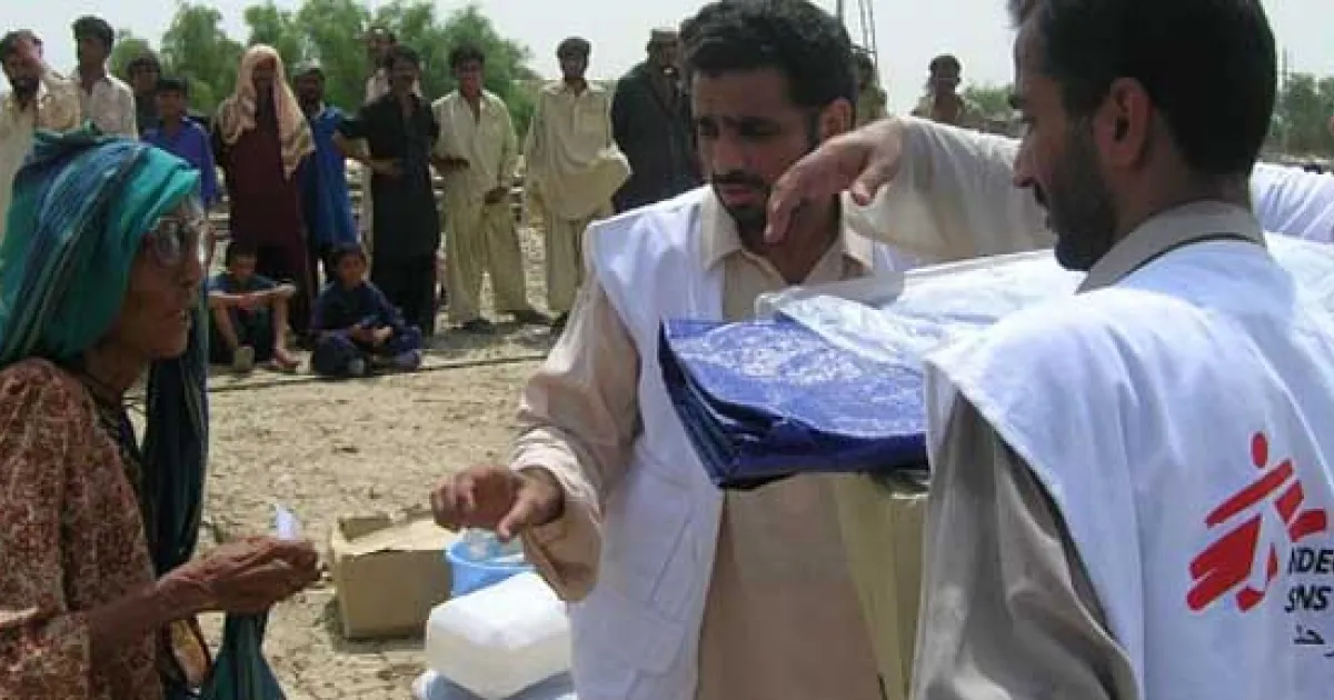 Pakistan, 04.08.2010: Mitarbeiter von Ärzte ohne Grenzen verteilen in der Provinz Baluchistan erste Hilfsgüter.