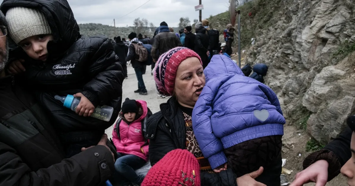 The family of Alia Alou from Afrin, Syria, waiting the bus to Mytilene's port outside the camp of Moria in Lesbos on February 10, 2016.