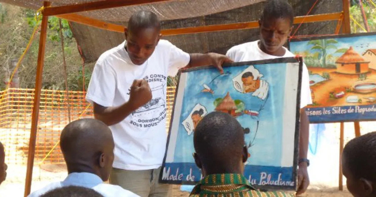 André spricht mit lauter Stimme, um das Geschrei der Kinder zu übertönen, die seinen Besuch sehr aufregend finden. „Heute werde ich euch vom Moskitonetz erzählen und wie ihr es am besten verwendet, um euch und eure Kinder vor der Malaria zu schützen“, beginnt er. Zwanzig Minuten lang klärt André die Dorfbewohnerinnen und -bewohner zu diesem Thema auf und fragt dann nach, ob es im Dorf Kranke gibt.