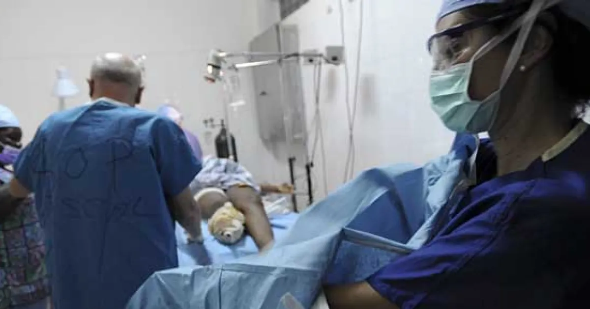 Port-au-Prince, Haiti, 16.01.2010: Amputation eines durch herabfallende Trümmer schwer verletzten, bereits von Wundbrand befallenen Beins eines zwölfjährigen Mädchen.