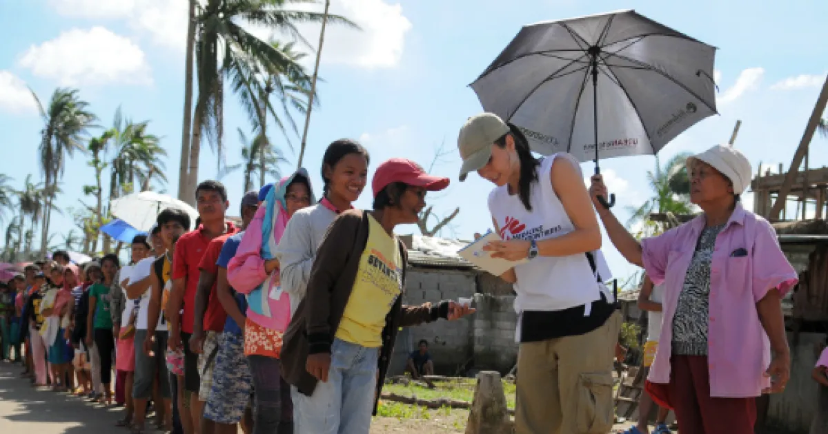 San Miguelay, Philippinen, 03.12.2013: Das Team von Ärzte ohne Grenzen verteilt Hilfsgüter in San Miguelay, einem Dorf in der Nähe von Santa Fe im Osten der Insel Leyte.