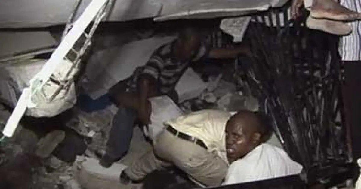 Port-au-Prince, Haiti, 12.01.2010: Männer versuchen, Studenten aus einem bei dem schweren Erdbeben eingestürzten Universitätsgebäude in Port-au-Prince zu befreien. Foto courtesy www.alertnet.org