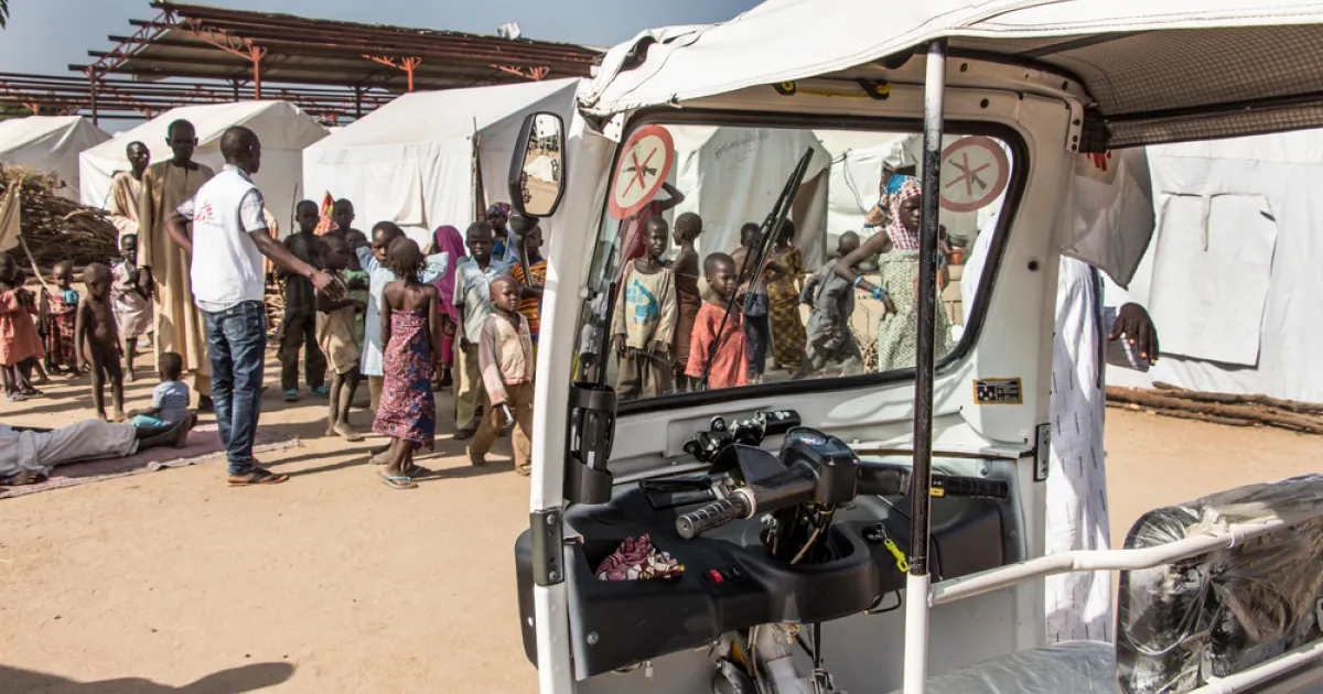 An MSF keke napep in the camp for displaced people in Gwoza, where MSF provides emergency and nutritional care, and sexual reproductive health services. Kekes are used as makeshift ambulances in Gwoza, where military curfews restrict the movements of heavier vehicles.