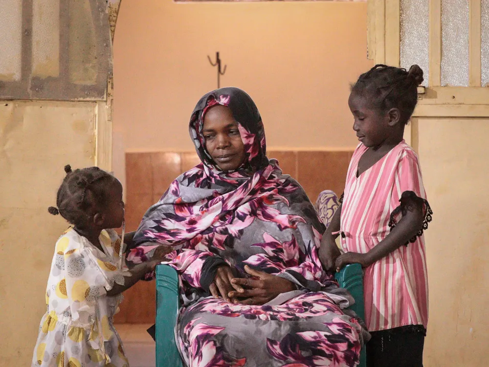 November 2024: Eine Mutter mit ihren Kindern in einer Gesundheitseinrichtung in Tawila. Sie erzählt, dass sie erleichtert ist, dass sie und ihre Familie medizinisch versorgt werden, nachdem sie über zwei Jahre lang Not und Vertreibung ohne Zugang zu medizinischer Versorgung leben mussten. Sie floh 2023 von Tawila nach El Fasher und kürzlich wieder von El Fasher nach Tawila.