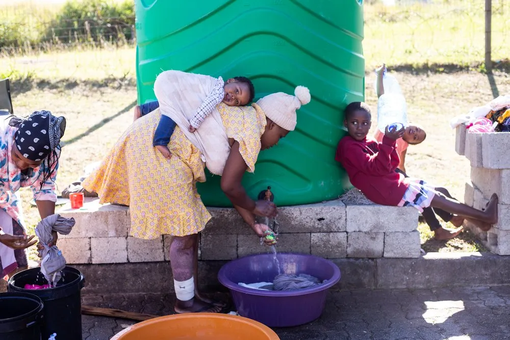 Um zu helfen, haben wir 40 Wassertanks in den wichtigsten Notunterkünften und Kliniken installiert, die größtenteils durch ein zunehmend effizientes kommunales Wassertanksystem oder durch unsere eigenen zwei Wassertankwagen gefüllt werden. Wassertanks sind jedoch extrem teuer, und mittel- und längerfristig sind auch nachhaltigere Lösungen erforderlich. Wir führen derzeit Gespräche mit der Stadt über die Errichtung einer Oberflächenwasseraufbereitungsanlage in Tongaat und das Bohren von Bohrlöchern in den Gemeinden Mfume und Mbulula im Süden von Durban.