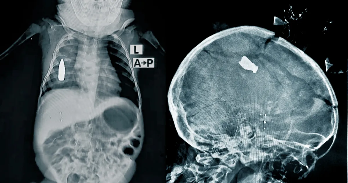 Röntgenbilder zeigen schwere Verletzungen bei Kindern: eine Kugel im Körper des 18 Monate alten Jungen und einen Granatsplitter im Kopf des 20 Monate alten Mädchens.