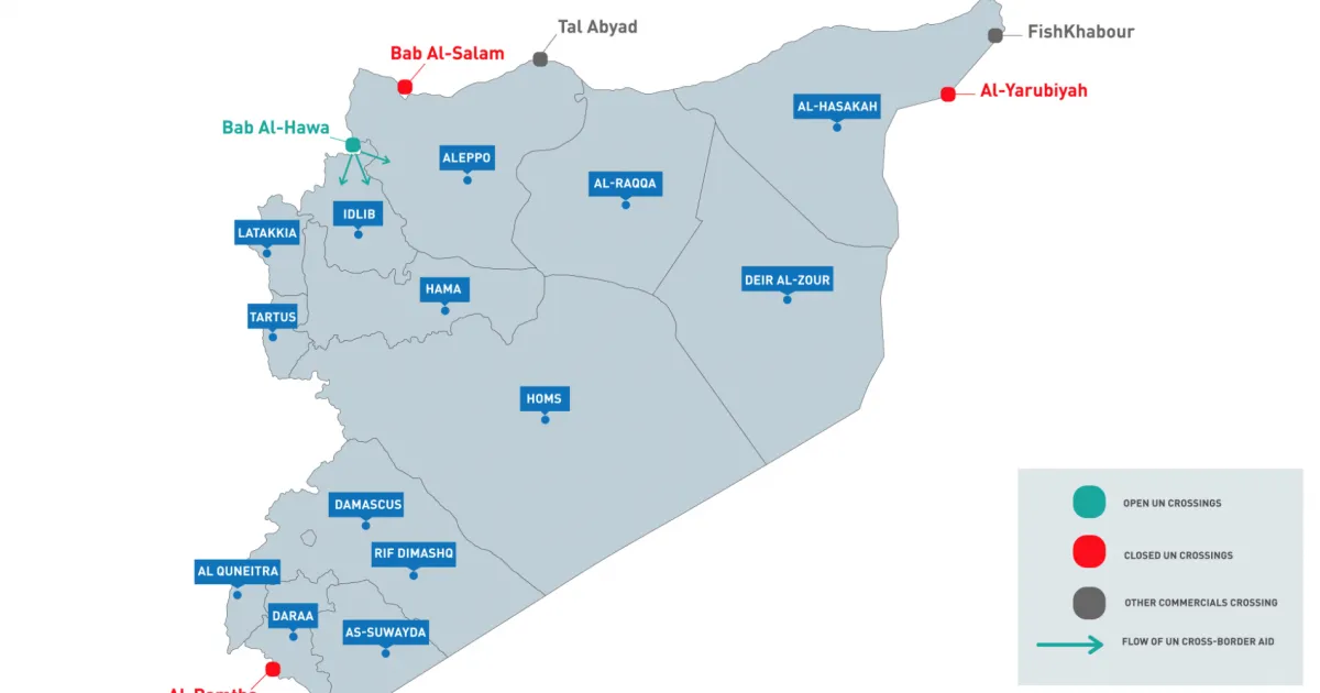 Die Vereinten Nationen einigten sich 2014 auf eine Grenzresolution. Diese erlaubt es der UNO und Nichtregierungsorganisationen, wichtige Hilfsgüter auch ohne die Zustimmung der syrischen Regierung über bestimmte Grenzübergänge in diejenigen Teile Syriens zu bringen, die nicht von der Regierung in Damaskus kontrolliert werden. Darüber hinaus ermöglicht es die Resolution Nichtregierungsorganisationen, Mittel für humanitäre Hilfe in dieser Region zu erhalten. Seither wurde bereits mehrfach neu über die Verlängerung der Resolution beraten. Seit Juli 2020 ist Bab al-Hawa der einzige offene Grenzübergang im Nordwesten Syriens und ohne erneute Verlängerung läuft die Resolution am 10. Juli 2022 aus.