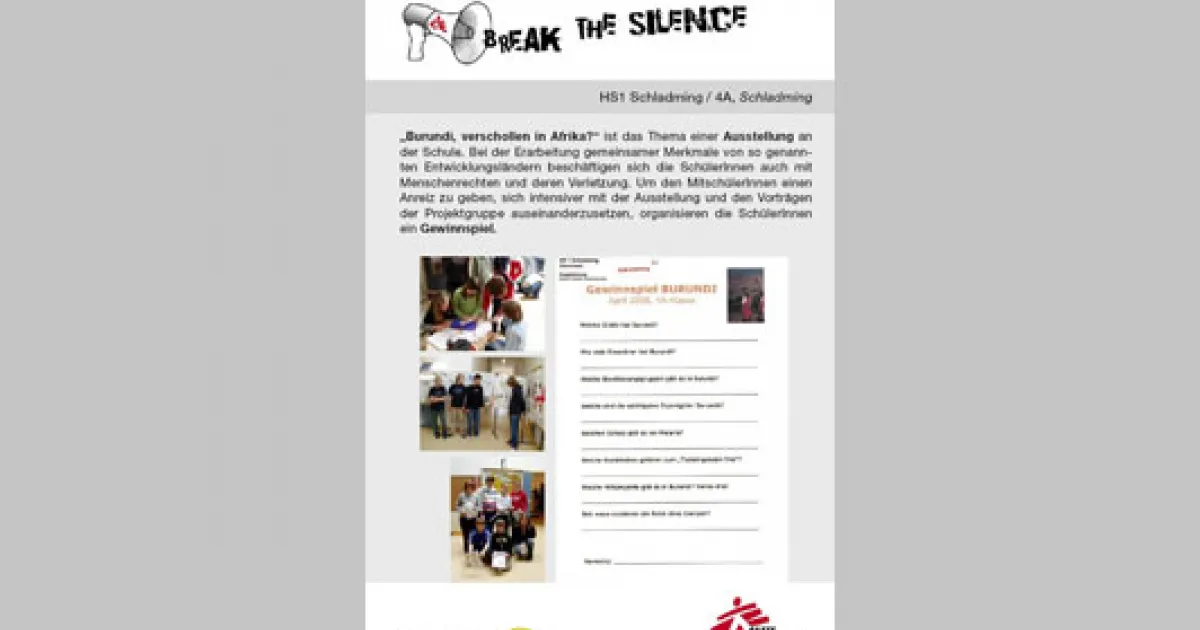 „Burundi, verschollen in Afrika?“ war das Thema einer Ausstellung an der Schule. Bei der Erarbeitung gemeinsamer Merkmale von so genannten Entwicklungsländern beschäftigten sich die SchülerInnen auch mit Menschenrechten und deren Verletzung.
