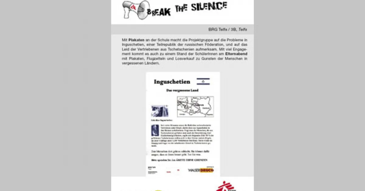 Mit Plakaten an der Schule machte die Projektgruppe auf die Probleme in Inguschetien, einer Teilrepublik der russischen Föderation, und das Leid der Vertriebenen aus Tschetschenien aufmerksam. Mit viel Engagement kam es auch zu einem Stand der SchülerInnen am Elternabend mit Plakaten, Flugzetteln und Losverkauf zu Gunsten der Menschen in vergessenen Ländern.