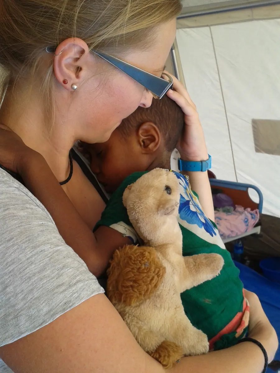 Und genau das sind die Momente, welche mich all die durchgearbeiteten Nächte, alle Frustrationen und den Stress vergessen lassen und ich mit einem Lächeln im Gesicht weiter machen kann. Solche Momente gibt es zum Glück ganz viele. Wenn ich die Kinder beobachte, wie sie herzhaft die Erdnusspaste verzehren, und du dann nach einer Woche die Hamsterbäckchen sehen kannst. Wenn sich die Eltern bei dir bedanken, ich kein Wort verstehe von dem was sie sagen (leider ist mein Somali noch nicht fließend), das strahlende von Herzen kommende Lächeln aber sowieso alle Worte überflüssig macht. Dafür nehme ich gerne hin, dass ich seit meiner Ankunft nur Reis oder Pasta esse, dass Dusche und WC sehr zu wünschen übrig lassen, dass ich keine Minute Privatsphäre habe, da wir alle zusammen in großen Zelten wohnen, und dass alles und immer (ich inklusive) voller Sandstaub ist, da wir mitten im Nirgendwo in der Wüste wohnen.