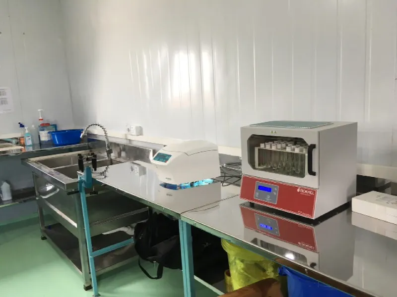 Das Labor ist leider noch immer nur sehr einfach ausgestattet, da das gesamte Equipment und die Reagenzien noch nicht aus Frankreich angekommen sind. Letzte Woche haben wir die erste Bluttransfusion durchgeführt - mit Erfolg. Der kleine Patient war ein nur sechs Monate altes Baby, mit massiver Unterernährung. Das Kind wog zwei Kilogramm und hatte Gerinnungsstörungen - 20ml Blut retteten sein Leben.