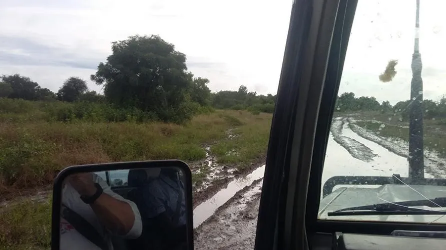 Langsam kommt die Landebahn in Sicht. Wir halten bei der Landebahn an, die nur mehr eine große Lacke ist. Ich steige aus dem Auto und versinke bis zu den Schuhbändern. Ich rufe bei der Basis an und sage „Flug abbrechen“.