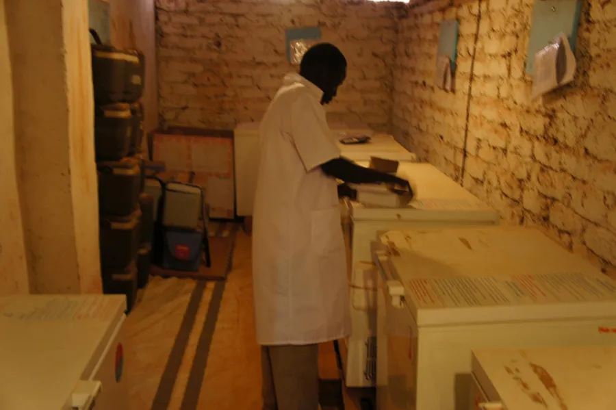 Ajagwo in unserem Kühlkettenraum: Wir haben zur Zeit sieben Kühltruhen gut gefüllt mit Impfstoffen und Arzneimitteln wie Insulin – und zwei Tiefkühltruhen für die Kühlelemente © Michi Posch/MSF