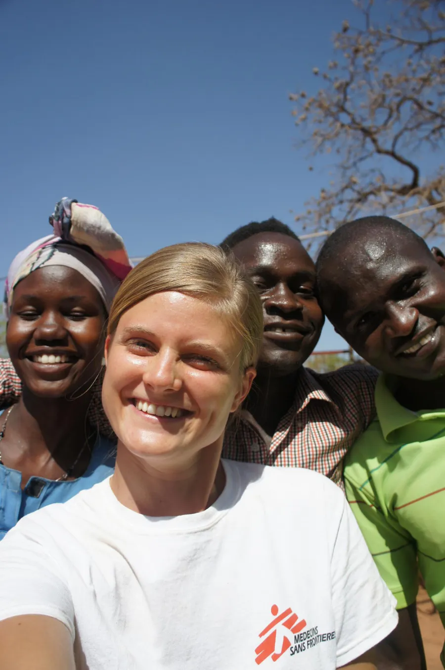 Yida-Selfie mit Elizabeth, einer Krankenschwester, Francis, dem Apothekenmanager, und Nazradin, dem Manager der logistischen Materialien (vom Beton bis zum Kugelschreiber) © Michi Posch/MSF