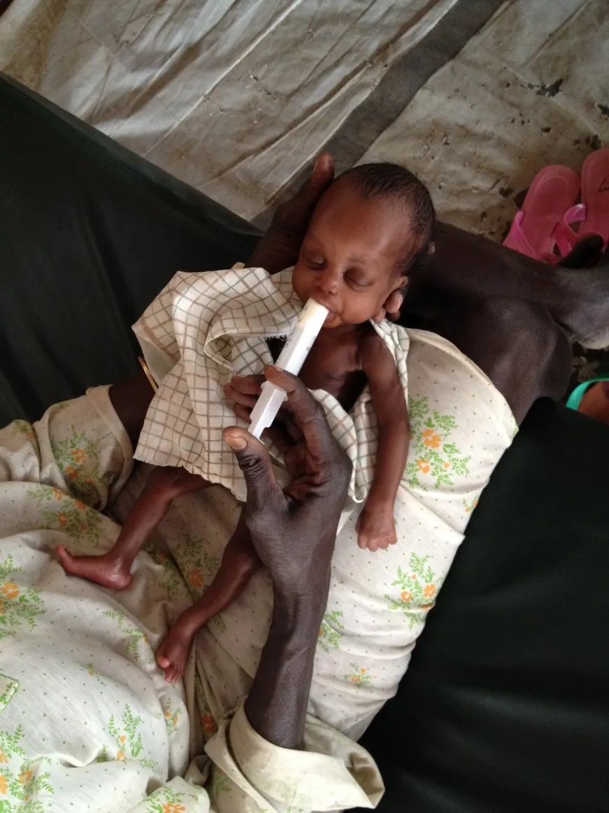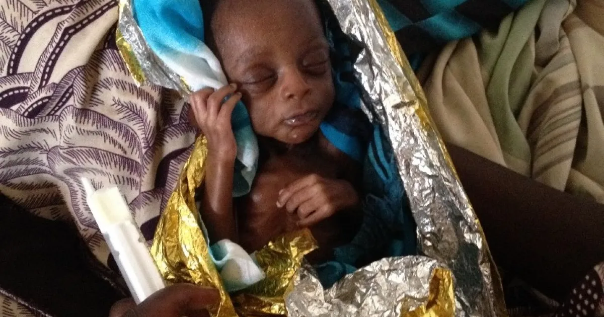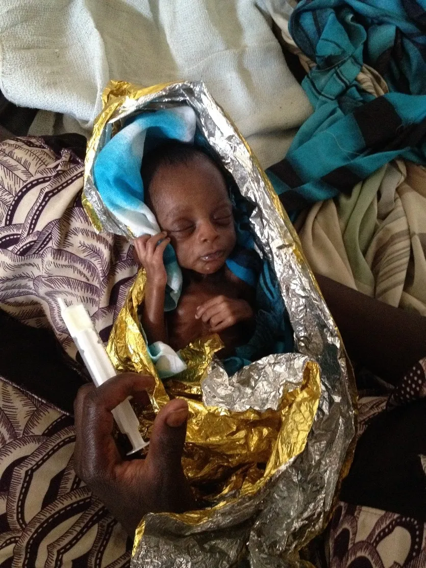 Bei meinem Dienstantritt Mitte Dezember bot sich mir ein Bild, das ich im ersten Moment gar nicht richtig erfassen konnte: Ein Frühgeborenes, gerade so groß, dass es in einer Hand Platz hat, eingewickelt in einer wärmenden Aludecke und Tüchern, neben seiner Mutter. Ein so junges Neugeborenes abseits jeglicher medizinischer Maschinerie zu sehen war fast nicht zu glauben. Als der Kerl dann auch noch begann, wie ein völlig reifes Neugeborenes an der Brust zu saugen, war ich sprachlos. Brachte er doch gerade einmal seinen Mund soweit auf, um die Brustwarze zu fassen. Was hatte ich denn bisher gelernt – ein afrikanischer Mini-Kämpfer straft mich hier in wenigen Minuten Lügen.