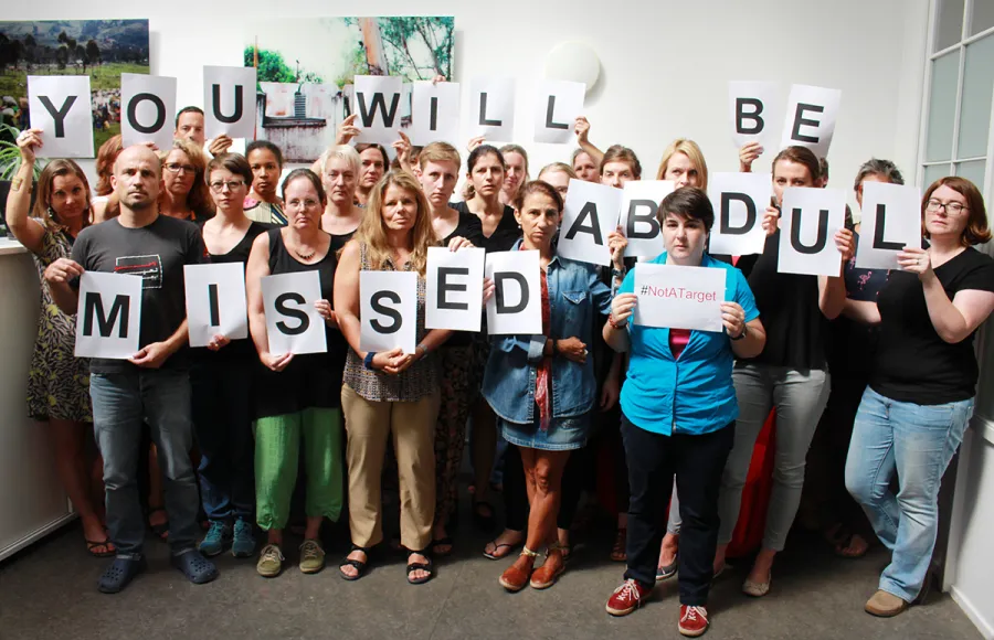 Wir gedenken unseres Kollegen Abdul Kareem, getötet beim Angriff auf ein Spital im Jemen, bei meinem Besuch im Büro in Wien. Ich halte hier den Aufruf #NotATarget - denn Krankenhäuser dürfen keine Angriffsziele sein!