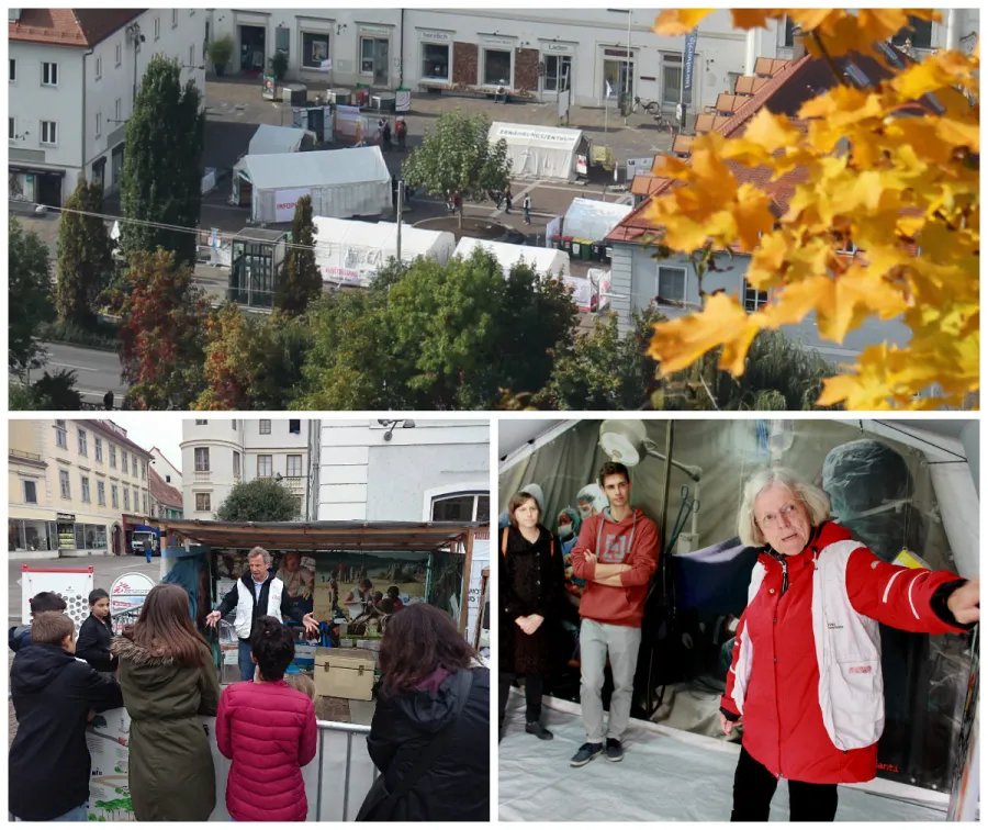 Graz, 16.10.2016: Die Ausstellung vom Schlossberg aus gesehen, Architekt Ricardo Baumgarten erklärt an der Impfstation die Kühlkette von Medikamenten und Impfstoffen, Krankenschwester Margaretha Sasker führt Gäste durch das aufblasbare Chirurgie-Zelt.