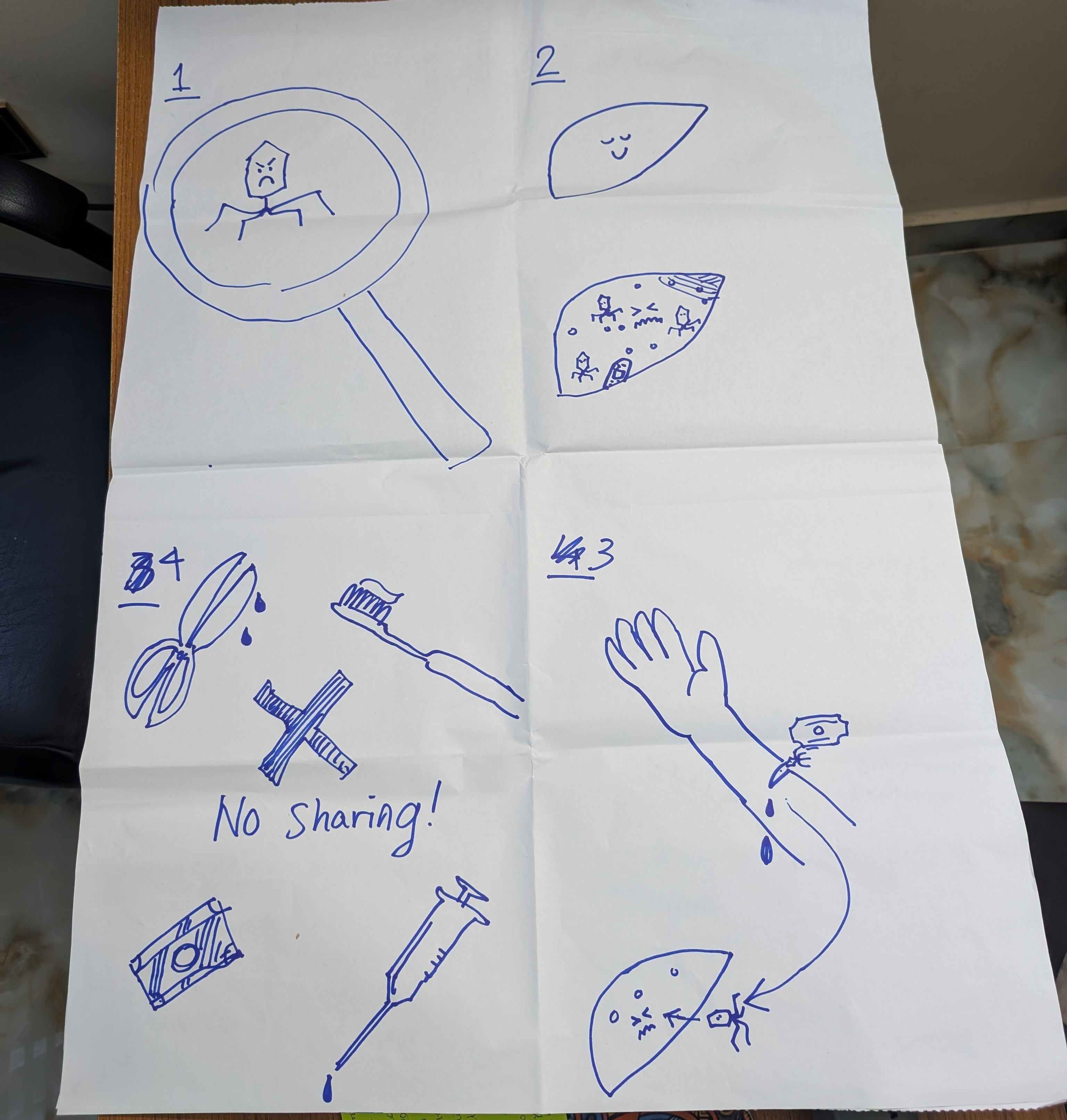 Allerdings gibt es oft sprachliche Hürden zwischen den Rohingya und den Bangladescher:innen. Und wie erklärt man eine unsichtbare Gefahr, wenn es keine gemeinsame Sprache gibt? Oder wenn viele Patient:innen nicht lesen oder schreiben können? Wir arbeiten mit Bildern, Symbolen, kleinen Geschichten – damit die Botschaft ankommt (Foto).