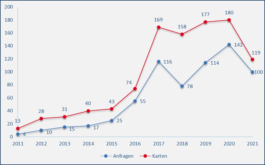 Unser Fachbereich ist seit 2015 Partner der GIS-Unit von Ärzte ohne Grenzen, wodurch alle Kolleg:innen innerhalb von Projekten und Headquarters von Ärzte ohne Grenzen satellitenbasierte Analysen bestellen können. Dies wirkte sich entscheidend auf die Anzahl der Anfragen aus. Während es in den ersten Jahren eine kontinuierliche Zunahme der Anfragen gab, stiegen diese ab 2016 sprunghaft an. Es war für uns schön zu sehen, dass die Kartenprodukte für die Projekte vor Ort immer mehr an Bedeutung gewannen. Mit der Zeit wurden wir natürlich routinierter und konnten unsere Analysen verbessern – in diesem Zusammenhang forschen wir seit Jahren an der Automatisierung von Satellitenbildauswertungen, um die manuelle Interaktion möglichst gering zu halten.