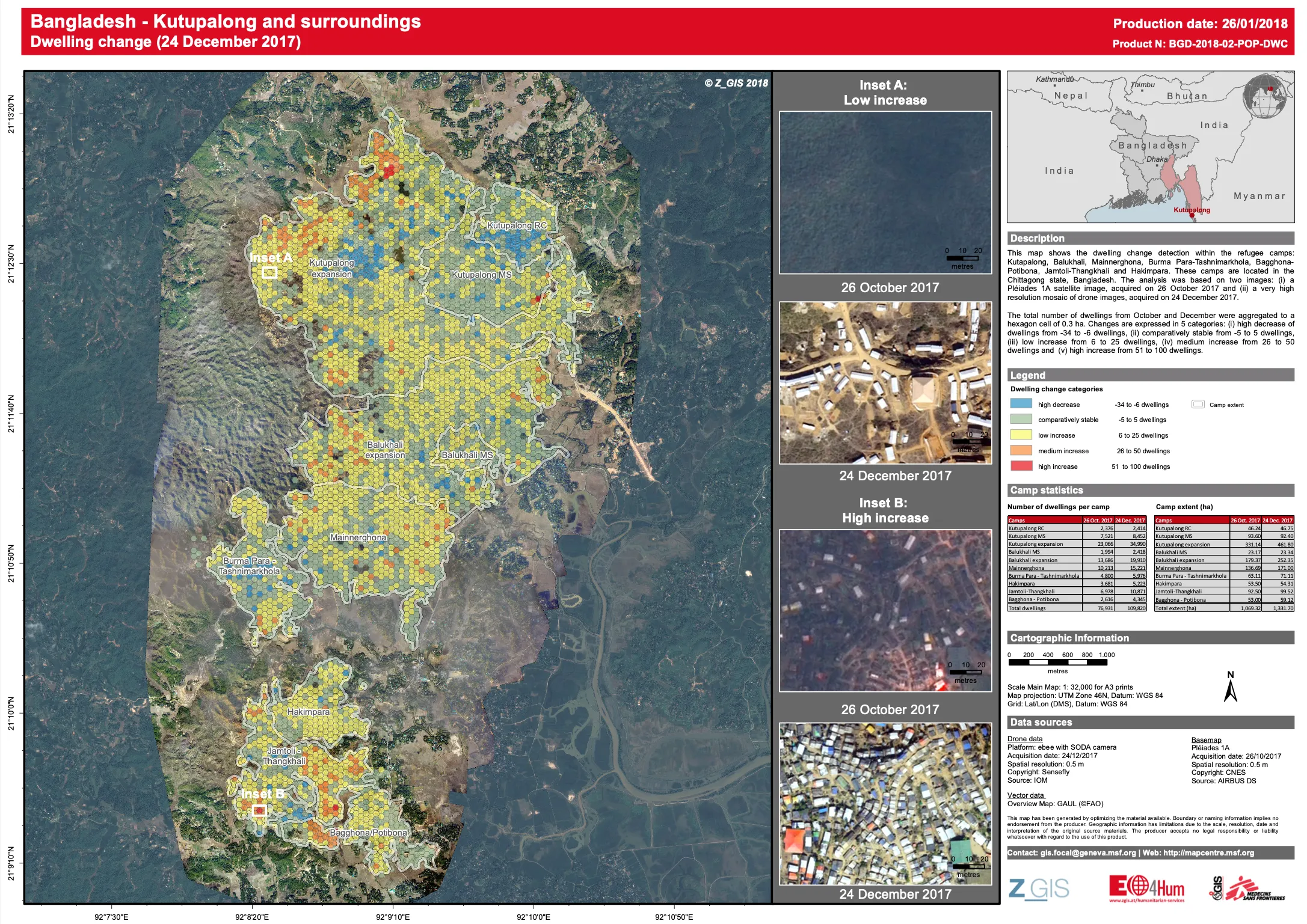 Diese Informationen können ebenfalls mit Hilfe satellitengestützter Informationen erhoben und regelmäßig aktualisiert werden. Datenbasis für dieses Produkt sind wie bei den Karten zur Bevölkerungsabschätzung ebenfalls sehr hoch aufgelöste Satellitenbilder von kommerziellen Anbietern, die zu verschiedenen Zeitpunkten - meist im Abstand mehrerer Wochen oder Monate - vom selben Ort aufgenommen wurden. Die Karte zu den Veränderungsanalysen der Bevölkerungsabschätzung gibt eine Übersicht zu diesen Änderungen und unterstützt Ärzte ohne Grenzen dabei, solche Dynamiken schnell zu erkennen und einzuschätzen.