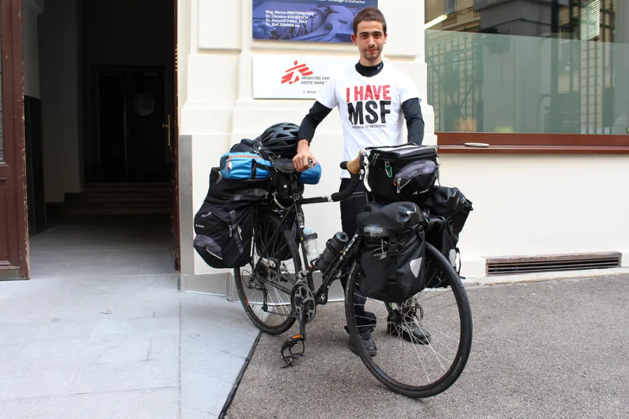 Heute Vormittag haben wir einen Überraschungsgast in unserem Büro in der Taborstraße empfangen: Der Medizinstudent Kevin de Matos ist mit dem Fahrrad (!) von der Westschweiz nach Wien gefahren. Der 26-Jährige macht gerade eine Tour durch Europa, um Ärzte ohne Grenzen zu unterstützen. Wir haben Kevin gefragt, wie es ihm bei seiner anstrengenden Reise geht: