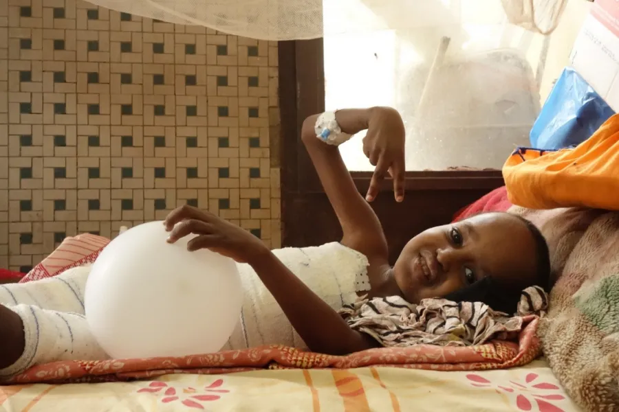 Der 5-jährige Adoum ist einer der Lieblinge in der Station. Der tapfere Junge hat schon ein halbes Jahr Krankenhausaufenthalt hinter sich, die Hälfte davon auf unserer Station. Der Heilungsprozess geht nur langsam voran, und gemeinsam mit der Mutter und dem Pflegepersonal versucht das Team von Ärzte ohne Grenzen dem Kleinen Hoffnung und – noch wichtiger – Ablenkung zu schenken. So zum Beispiel ganz einfach mit einem Luftballon.
