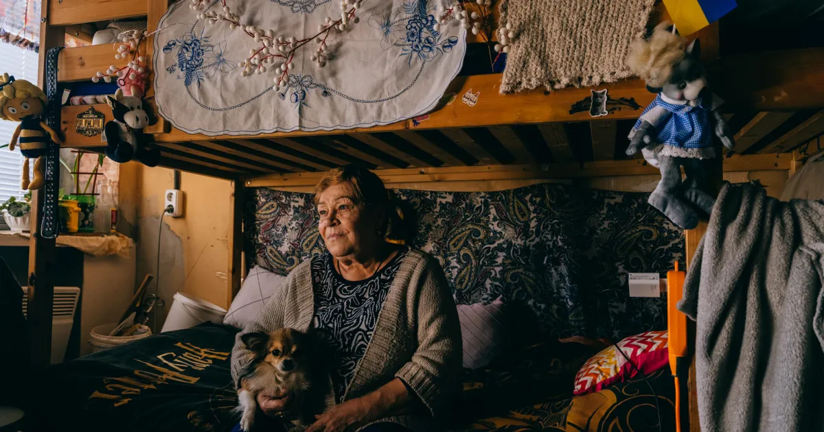 Zinaida mit ihrem Hund Toshyk in der Notunterkunft in Dnipro.