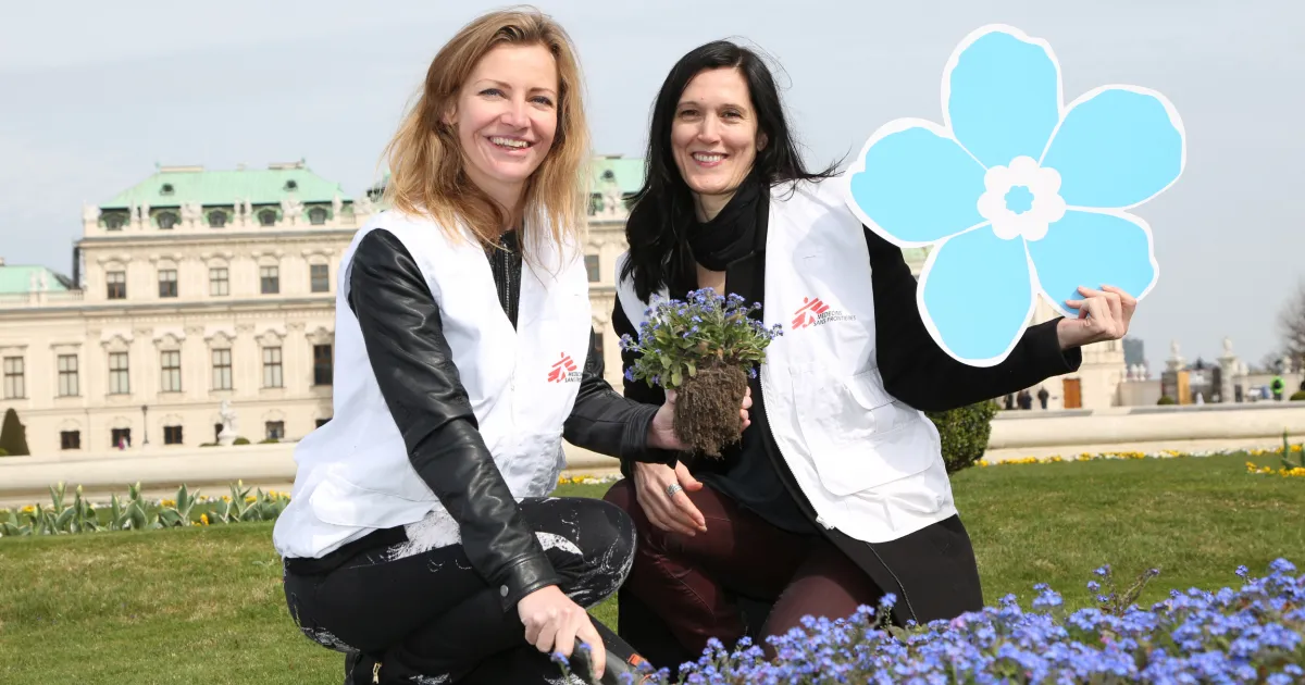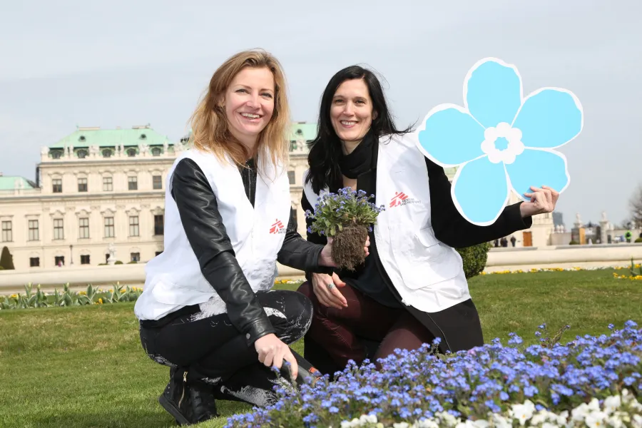 Dagmar Hengl und Michaela Bruckner von Ärzte ohne Grenzen Österreich beim Pflanzen der Vergissmeinnicht