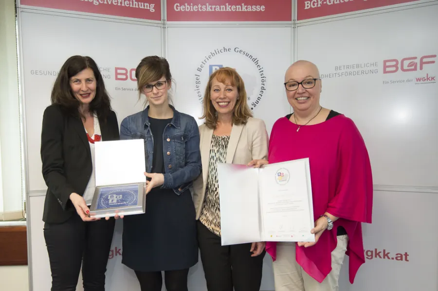 Das BGF-Siegel sowie die Urkunde wurden von Gesundheitsministerin Sabine Oberhauser und der Obfrau der WGKK, Ingrid Reischl, überreicht. Insgesamt erhielten das Gütesiegel 15 Organisationen, die BGF nach den Kriterien des „Europäischen Netzwerkes BGF“ umgesetzt haben und dadurch die Gesundheit ihrer Mitarbeiterinnen und Mitarbeiter fördern.