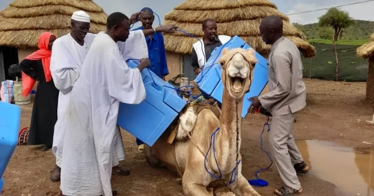 Dromedar Kenny bringt dringend benötigte Masernimpfstoffe und medizinische Hilfsgüter über Stock und Stein in eine abgelegene Bergregionen im Sudan.
