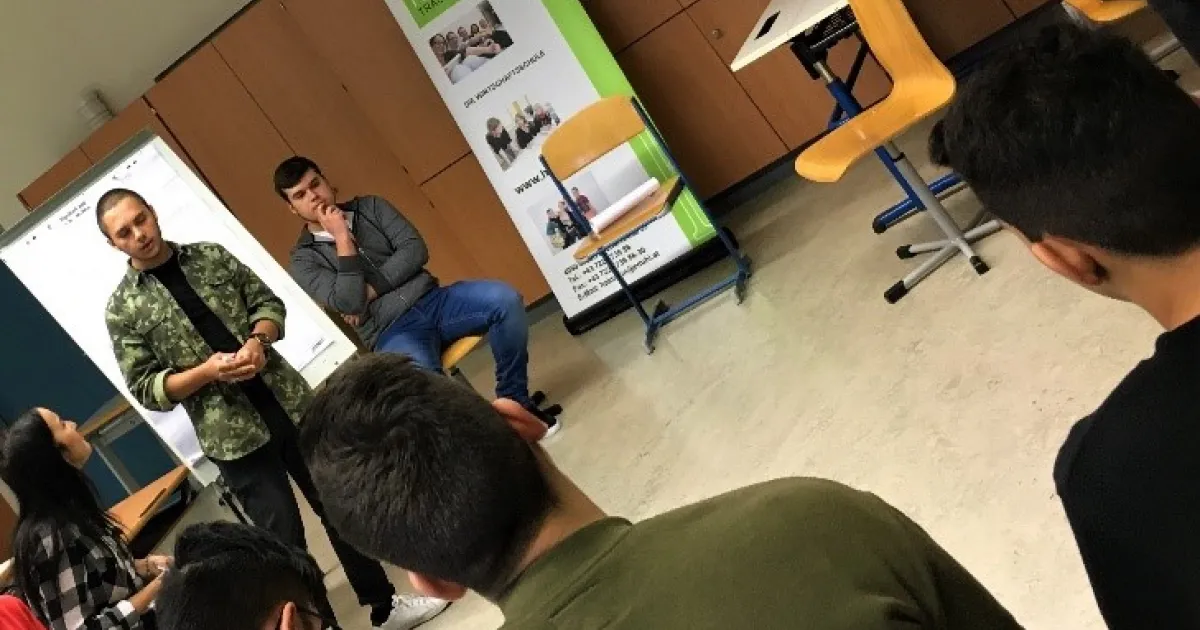 Die Schülergruppe der BHAK Traun spricht mit den Schülern der Mittelschule über den Workshop.