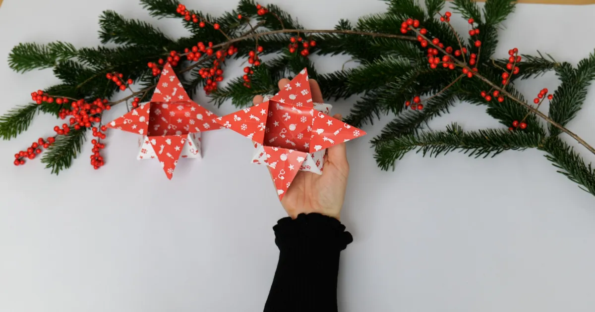 Anleitung Origami Box selber machen. Eine Hand hält eine aus weihnachtlichem Papier gefaltene Box in Sternform. Im Hintergrund grüne Äste mit Nadeln und rote Früchte.