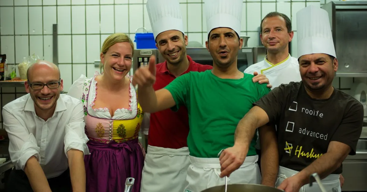 Jakob Hintersteininger, Sigrid Blumschein, Amjad, Endre Farkas (Küchenchef Hotel Grüner Baum), Mahmud (v.l.)