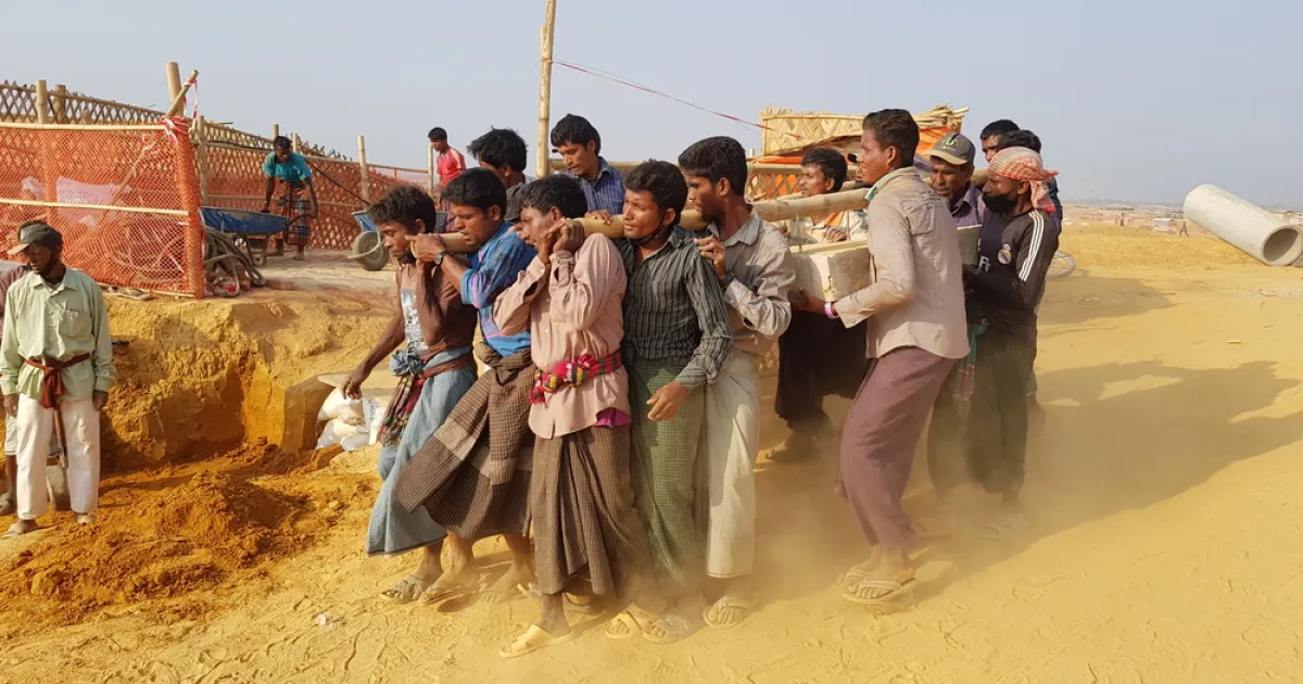 Ouvriers transportant des matériaux sur le chantier de construction de l’hôpital MSF. L’ hôpital de 100 lits que MSF a construit au milieu du camp de Kutupalong-Balukhali où vivent les réfugiés rohingya, est ouvert depuis le 14 avril. Workers transporting materials on the building site of the MSF hospital. MSF has built a 100 bed hospital in the middle of the Kutupalong-Balukhali camp which opened on April 14.