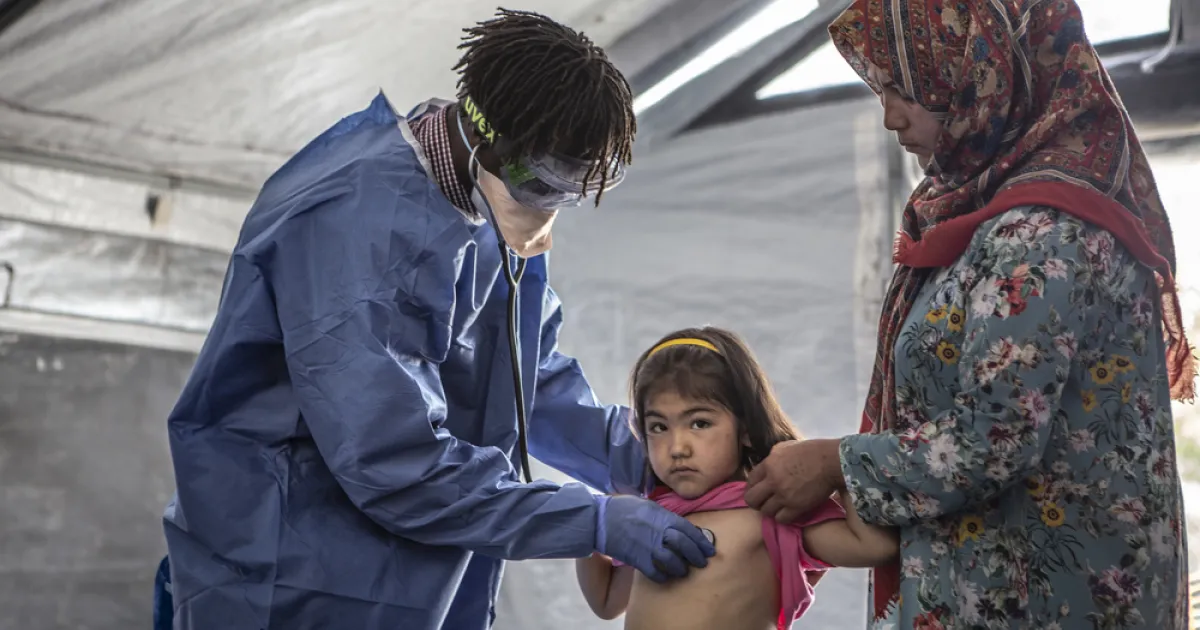 MSF medical staff in Moria working in full PPE. After COVID-19 pandemic MSF has adapted its procedures in order to keep patients and staff safe. In the pediatric clinic outside Moria camp, patients (children and pregnant women) pass through a first screening. If they present respiratory problems or fever they are directed towards an area where a team is able to assess them in a safe way, without any physical contact, as these symptoms might be similar with the COVID-19 ones. If the patient with these symptoms needs to be further examined the teams is examining the patient in full PPE.