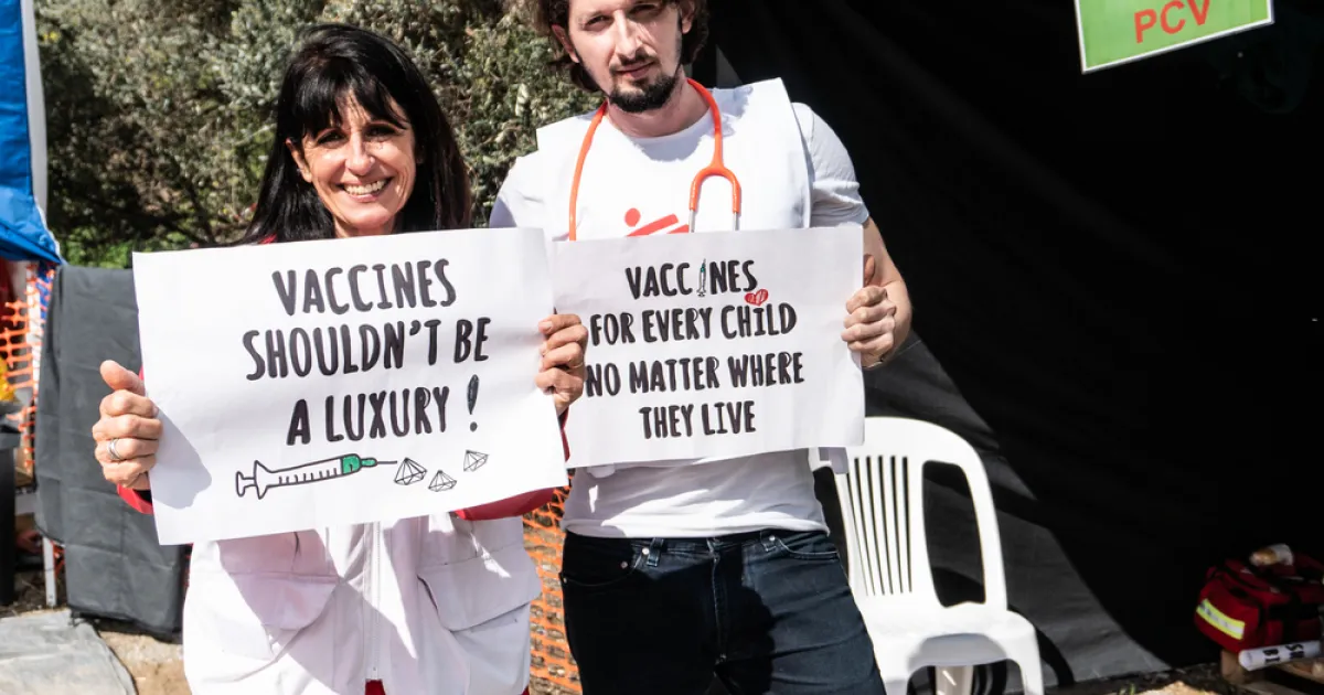 MSF medical staff, Corinne Peters and Stefanos Tsallas holding signs advocating for broader use of the pneumonia vaccine at a lower price
