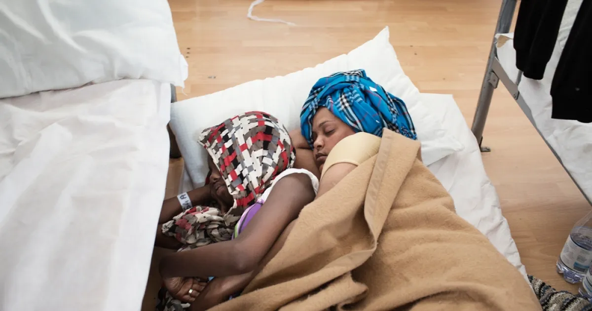 A mother and daughter from Eritrea rest inside the CPSA (Centro di primo soccorso ed accoglienza – first reception centre) in Pozzallo, where MSF responds to the medical and humanitarian needs of migrants, refugees and political asylum seekers.