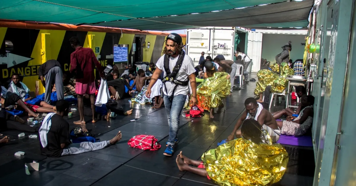 Cultural mediator, Firas Hebili, walks between those rescued onboard the Bourbon Argos, while they are treated by Medecins Sans Frontieres (MSF) staff.
