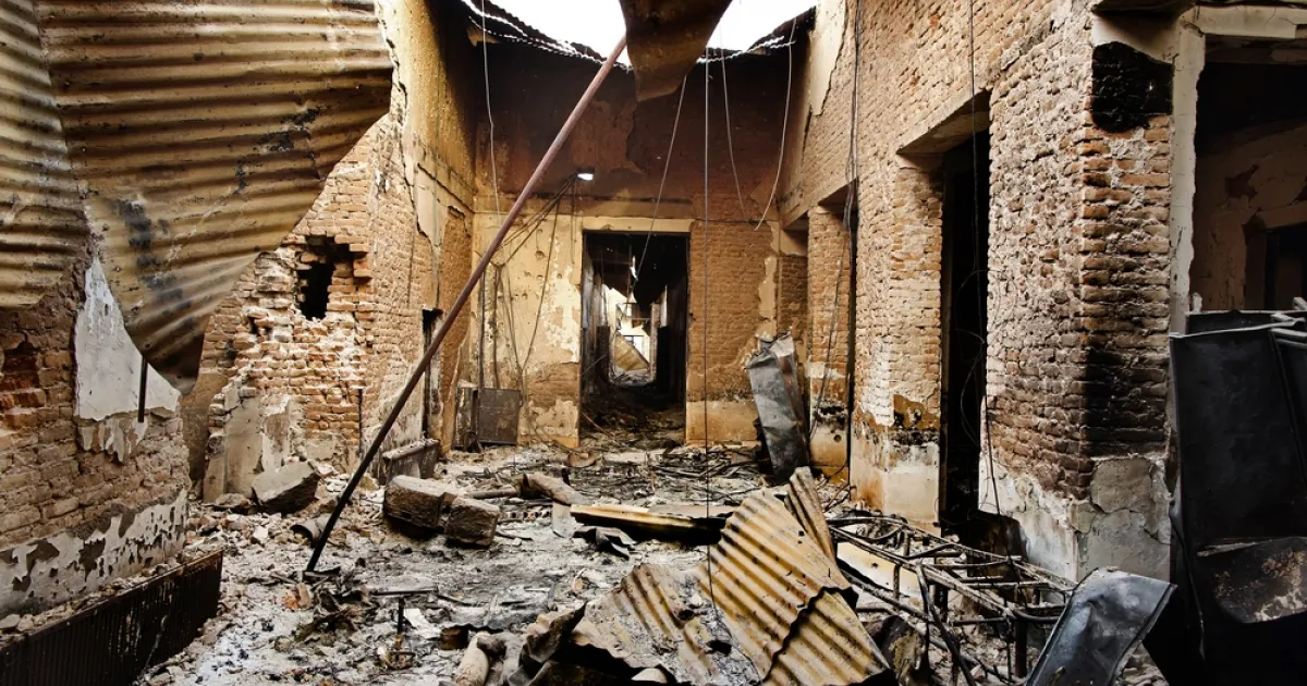 Iron roofing and rubble litter a corridor in the MSF Kunduz Trauma Centre as the facility lies destroyed following the 03 October aerial attack which killed 22 staff and patients in northern Afghanistan. The bomb blasts were so strong that the corrugated iron roof caved in here in the blood laboratory corridor, and elsewhere in the hospital building.