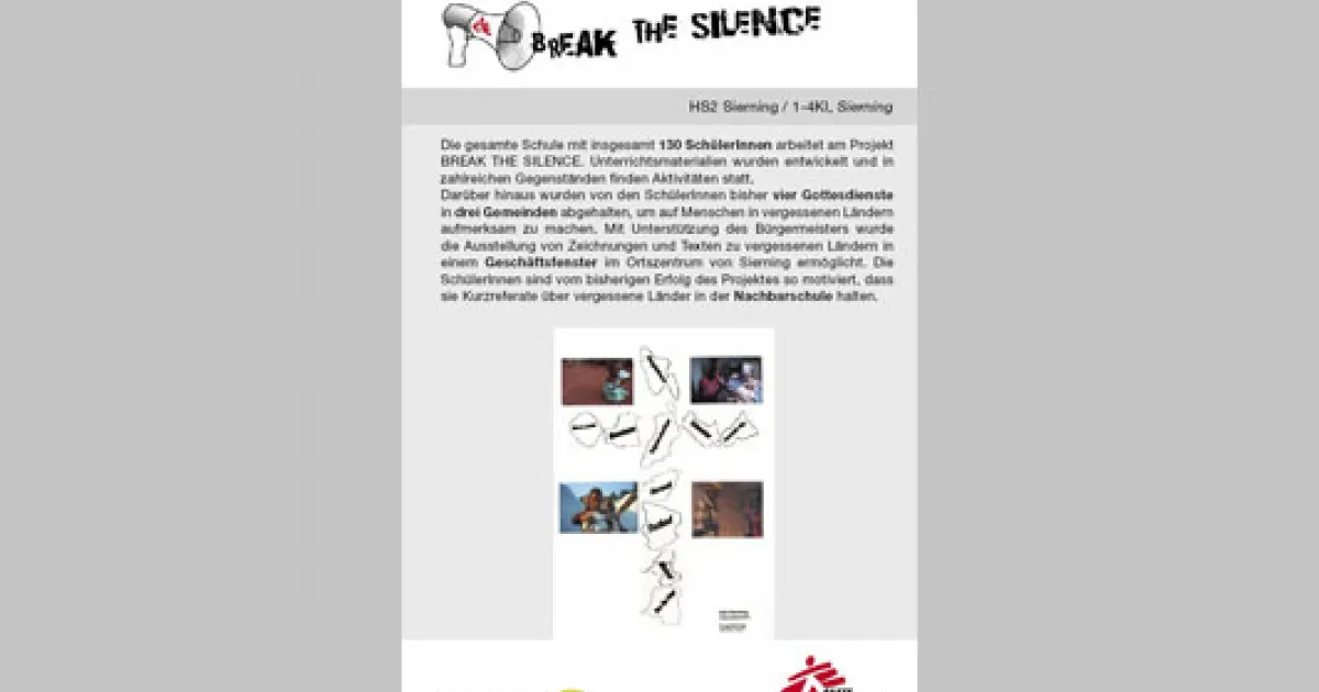 Die gesamte Schule mit insgesamt 130 SchülerInnen arbeitete am Projekt Break the Silence. Dabei wurden Unterrichts- materialien entwickelt und in zahlreichen Gegenständen fanden Aktivitäten statt.