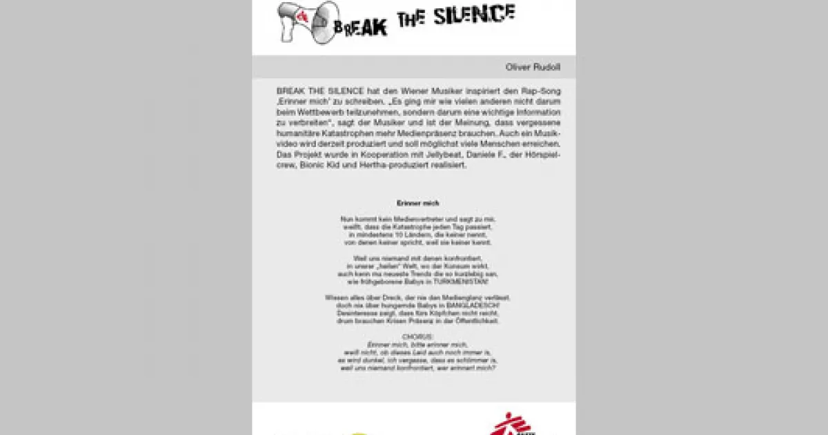 Break the Silence hat den Wiener Musiker inspiriert eine Ärzte ohne Grenzen Version seines Rap-Songs ‚Erinner mich’ zu schreiben. „Es ging mir wie vielen anderen nicht darum bei einem Wettbewerb teilzunehmen, sondern darum eine wichtige Information zu verbreiten“, sagt der Musiker und ist der Meinung, dass vergessene humanitäre Katastrophen mehr Medienpräsenz brauchen.  Das Projekt wurde in Kooperation mit Jellybeat, Daniele F., der Hörspielcrew, Bionic Kid und Hertha produziert und realisiert.