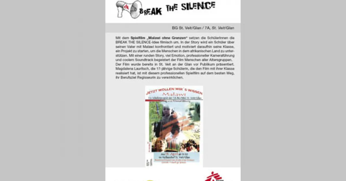 Mit dem Spielfilm „Malawi ohne Grenzen“ setzten die SchülerInnen die Break the Silence-Idee auf geradezu geniale Art und Weise filmisch um. In der Story wurde ein Schüler über seinen Vater mit Malawi konfrontiert und motivierte daraufhin seine Klasse, ein Projekt zu starten, um die Menschen in dem afrikanischen Land zu unterstützen. Mit einer runden Story, viel Emotion, professioneller Kameraführung und coolem Soundtrack begeisterte der Film Menschen aller Altersgruppen.
