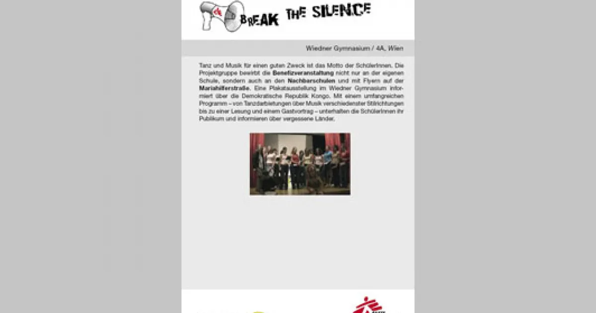 Tanz und Musik für einen guten Zweck war das Motto der SchülerInnen. Die Projektgruppe bewarb die Benefizveranstaltung nicht nur an der eigenen Schule, sondern auch an den Nachbarschulen und mit Flyern auf der Mariahilferstraße. Eine Plakatausstellung im Wiedner Gymnasium informierte über die Demokratische Republik Kongo. Mit einem umfangreichen Programm – von Tanzdarbietungen über Musik verschiedenster Stilrichtungen bis zu einer Lesung und einem Gastvortrag – unterhalteten die SchülerInnen ihr Publikum und informierten über vergessene Länder.