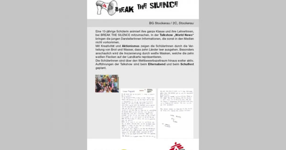 Eine 13-jährige Schülerin animierte ihre ganze Klasse und ihre LehrerInnen, beim Jugendprojekt Break the Silence mitzumachen. In der Talkshow „World News“ brachten die jungen DarstellerInnen Informationen, die sonst in den Medien nicht vorkommen.